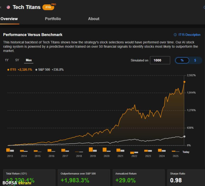 Her ayın başında, yapay zekamız her stratejiyi 20’ye kadar hisse seçimiyle yeniliyor. Bu seçimler, makine öğrenimi modelimiz tarafından dünya çapında 15 yılı aşkın finansal veri üzerinde derlenen 150’den fazla köklü finansal modelin bir karışımına dayanıyor. Bazı hisseler ekleniyor, bazıları korunuyor ve birkaçı çıkarılıyor. Bu, modelin her şirketin orta vadeli büyüme potansiyelini nasıl yeniden değerlendirdiğini yansıtıyor. Performansı takip etmek için, her strateji seçilen tüm hisselerde eşit ağırlık kullanıyor. Bu ağırlığı tam olarak takip etmeniz gerekmese de, modelin fırsatları ne kadar iyi belirlediğini değerlendirmek için tutarlı bir kıyaslama ölçütü sunuyor. Sonuçta, hisse seçimi hala bir olasılık oyunu. Ancak anahtar sadece kazananları bulmak değil, artık uygun olmayanlardan ne zaman vazgeçileceğini bilmektir. Lansmandan bu yana, model tam olarak bunu yaptı ve yol boyunca birkaç öne çıkan başarı hikayesi sundu. Aslında, geri testlerimiz, uzun vadede gitmenin uzun vadeli servet oluşturmanın en emin yolu olduğunu gösteriyor. Aşağıda Tech Titans’ınS&P 500 üzerindeki 12 yıllık performans farkını inceleyin: