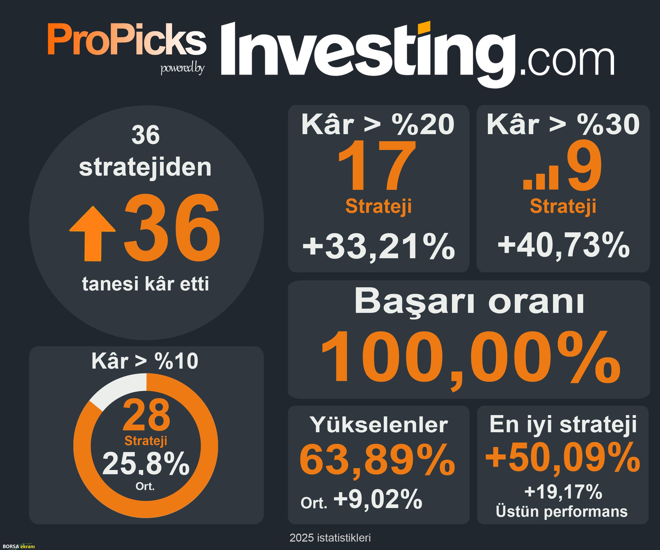 Investing.com – Dalgalı bir sürecin ardından ABD piyasaları yeniden iyimserlik kazanıyor: Pazartesi günü endeksler haftaya güçlü yükselişlerle başladı. Bu toparlanmayı, ABD-Çin ticaret geriliminde yaşanan yumuşama sinyalleri ve teknoloji hisselerinin sağlam performansı destekledi. Ancak tablo hâlâ kırılgan: Piyasalar bu ivmeyi sürdürebilecek mi, yoksa Washington’daki yeniden tırmanan bütçe krizi gibi siyasi riskler yeni bir sarsıntıya mı yol açacak? Bu yazıda, dalgalı dönemler için stratejik yaklaşımları ele alıyor ve 2025’te ProPicks yapay zekâ stratejileri arasında zirvede yer alan yaklaşımı açıklıyoruz. Pazartesi gününün ABD ProPicks kazananları şöyleydi:Böylece bazı ABD ProPicks stratejileri aylık kazançlarını artırmayı başardı. Orta Ölçekli Harikalar (Mid Cap Marvels) stratejisi, Ekim ayında %5,51 getiri sağlarken, S&P Midcap 400 endeksi -%0,41 kayıp yaşadı. 11 ABD ProPicks stratejisinden 8’i şu anda pozitif bölgede ve tamamı kendi karşılaştırma endekslerini geride bırakıyor. Yapay zekâ bu zorlu koşullar altında yalnızca ABD’de değil, dünyanın diğer bölgelerinde de güçlü bir performans sergiliyor. İşte bazı örnekler: InvestingPro Üyesi Olmak İçin Tıklayın Yıllık bazda, 2025 yılı için ProPicks stratejilerinin sonuçları şöyle:Yılın en büyük sürprizi ise İspanya Piyasa Liderleri oldu. Bu yapay zekâ destekli hisse seçimi 2025 boyunca %50,09 yükselerek listenin zirvesine yerleşti. Aynı dönemde IBEX 35 endeksi yalnızca %36,74 artış gösterdi. Yani bu strateji endeksi tam 13,35 puan farkla geride bıraktı.