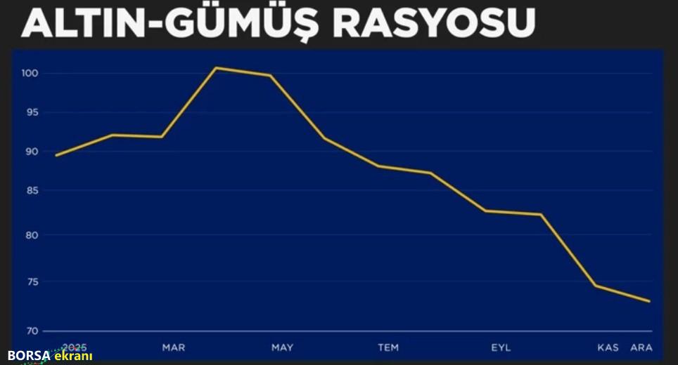 Altın/gümüş rasyosu, iki metal arasındaki uzun vadeli değer dengesini gösterir. 2025’te gümüşün hızlı yükselişiyle bu oran önemli ölçüde daraldı. Nisan ayında 105 seviyelerinde olan rasyosu, Aralık başında 70’lerin ortasına kadar gerileyerek son yılların en düşük seviyelerine indi. Bu görünüm, gümüşün altına karşı belirgin bir güç kazandığını gösteriyor.