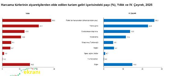 Turizm geliri geçen yılın aynı çeyreğine göre yüzde 9,9 arttı Turizm geliri Ekim, Kasım ve Aralık aylarından oluşan dördüncü çeyrekte bir önceki yılın aynı çeyreğine göre yüzde 9,9 artarak 15 milyar 151 milyon 842 bin dolar oldu. Ziyaretçilerden elde edilen turizm geliri 14 milyar 939 milyon 353 bin dolar, transfer yolculardan elde edilen turizm geliri ise 212 milyon 488 bin dolar oldu. Ziyaretçilerin turizm gelirinin yüzde 19,1’ini Türkiye’yi ziyaret eden yurt dışı ikametli vatandaşlar oluşturdu. Bu çeyrekte ziyaretçiler tarafından yapılan harcamaların 11 milyar 28 milyon 37 bin dolarını kişisel harcamalar, 3 milyar 911 milyon 317 bin dolarını ise paket tur harcamaları oluşturdu. Ziyaretçi sayısı geçen yıl yüzde 2,7 arttı Türkiye’den çıkış yapan ziyaretçi sayısı 2025 yılında bir önceki yıla göre yüzde 2,7 artarak 63 milyon 917 bin 57 kişi oldu. Bunların yüzde 17,5’ini 11 milyon 175 bin 394 kişi ile yurt dışında ikamet eden vatandaşlar oluşturdu.