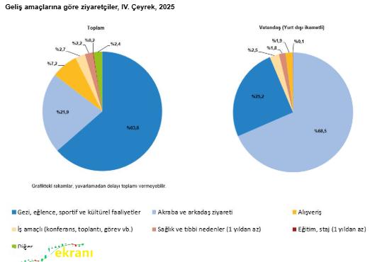 Bu çeyrekte ziyaretçilerin geliş amaçlarında birinci sırada yüzde 63,6 ile “gezi, eğlence, sportif ve kültürel faaliyetler” yer alırken, yurt dışı ikametli vatandaşlar Türkiye’yi yüzde 68,5 ile en çok “akraba ve arkadaş ziyareti” amacıyla geldi.