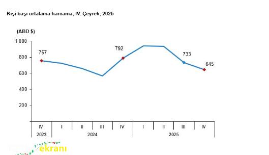 Yıllık olarak geceleme yapanların gecelik ortalama harcaması 100 dolar, yurt dışında ikamet eden vatandaşların gecelik ortalama harcaması ise 64 dolar oldu. Ziyaretçi sayısı geçen yılın aynı çeyreğine göre yüzde 5,9 arttı Türkiye’den çıkış yapan ziyaretçi sayısı 2025 yılı dördüncü çeyreğinde bir önceki yılın aynı çeyreğine göre yüzde 5,9 artarak 14 milyon 744 bin 1 kişi oldu. Ziyaretçilerin yüzde 19,3’ünü 2 milyon 839 bin 596 kişi ile yurt dışında ikamet eden vatandaşlar oluşturdu.