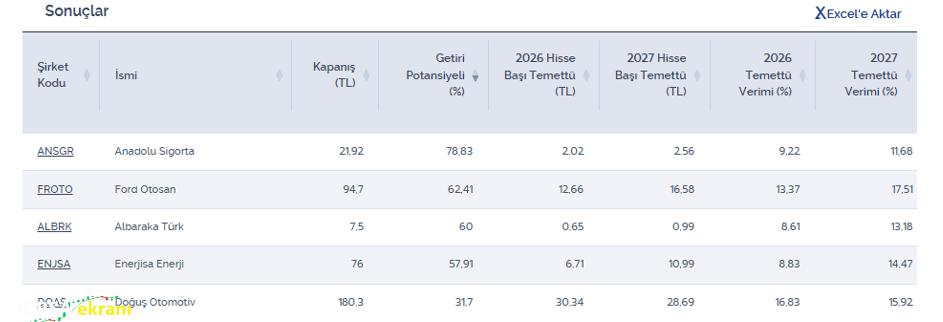 İş Yatırım; bu sıralamayı, söz konusu hisseler için belirlediği hedef fiyatlara göre hisselerin sunduğu getiri potansiyeline (%) göre yaptı. Söz konusu hisselerin 2026 ve 2027 yılları için hisse başına temettü miktarına (TL) ve temettü verimine (%) de listede yer verildi.nbsp;İş Yatırım’ın hesaplamasına göre; 2026 yılında temettü verimi açısından ilk sırada yüzde 16,83 ile Doğuş Otomotiv yer alıyor. Onu yüzde 13,37’lik temettü verimiyle Ford Otosan izliyor. 2027 yılında ise temettü verimi açısından Ford Otosan yüzde 17,51 ile ilk sıraya yükselirken Doğuş Otomotiv ise yüzde 15,92 ile ikinci sırada bulunuyor. Hisselerdeki getiri potansiyelinin ve temettü veriminin söz konusu hisselerin 14 Kasım’daki kapanış fiyatlarına göre hesaplandığı notunu da düşelim. Söz konusu liste ise şöyle: nbsp;