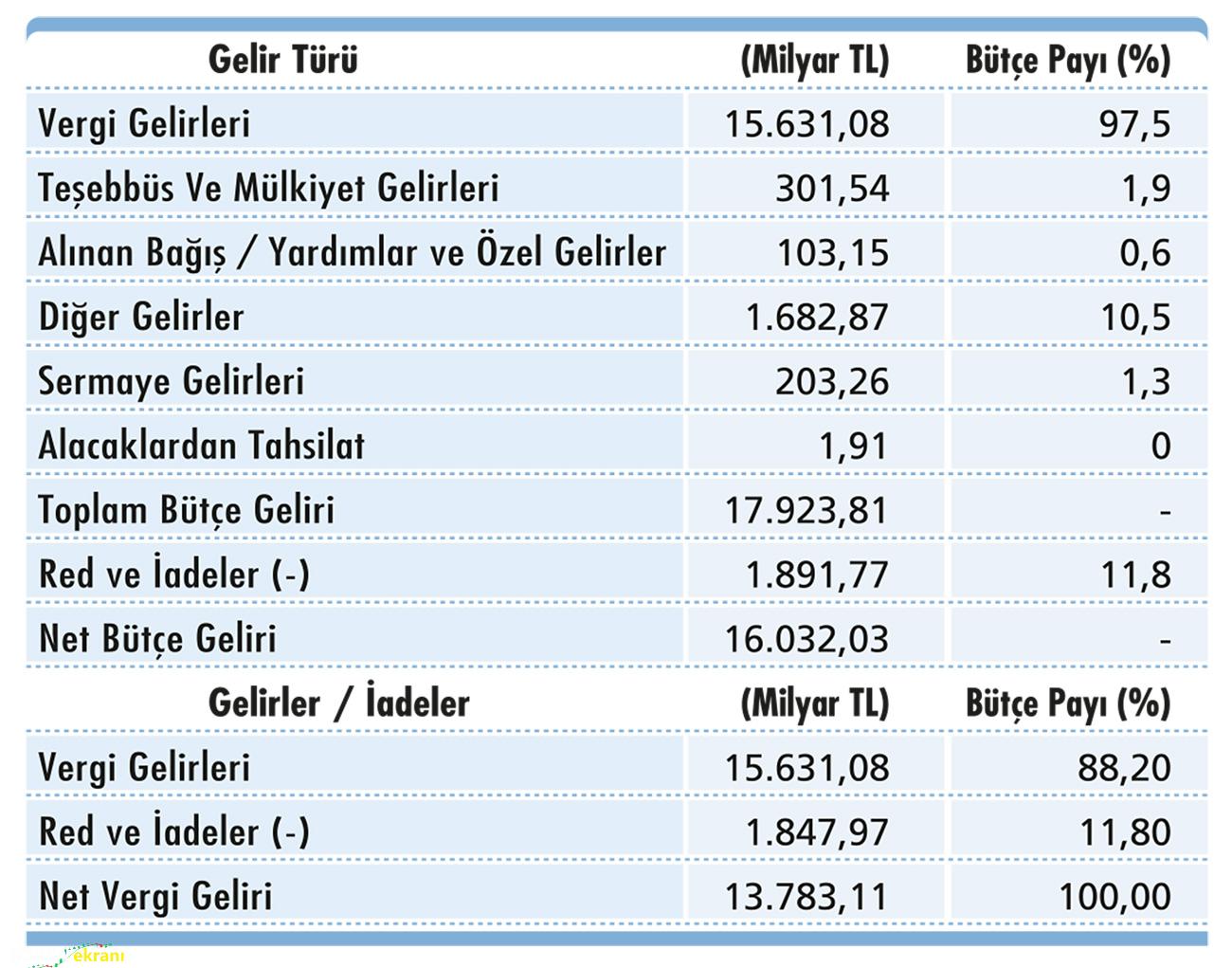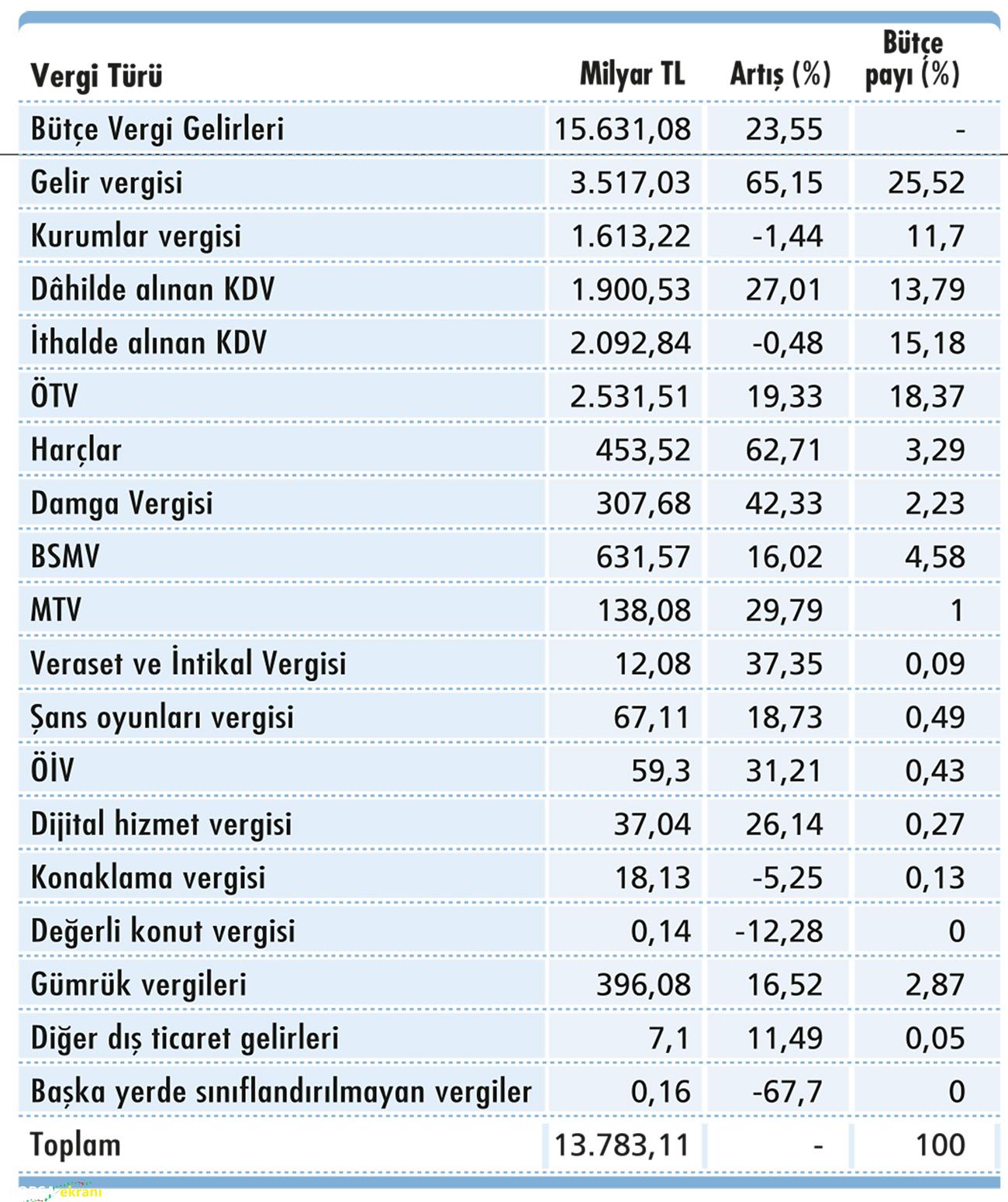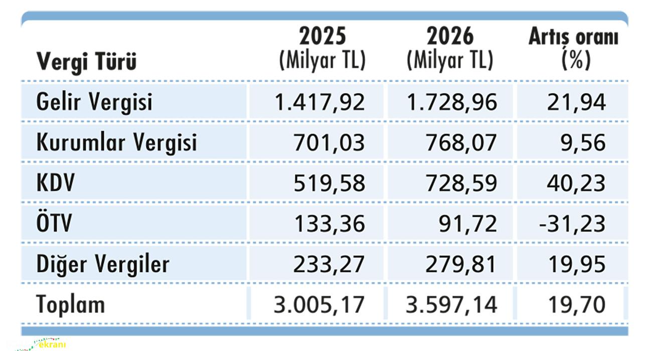 2026 yılı bütçe cetvellerindeki tutarlara göre toplam vergi gelirleri hedefi brüt 15.631,08 milyar TL (red ve iadeler öncesi) olup, vergi türleri itibarıyla dağılımı ile bir önceki yıla göre vergi türlerine göre artışlar şu şekildedir: