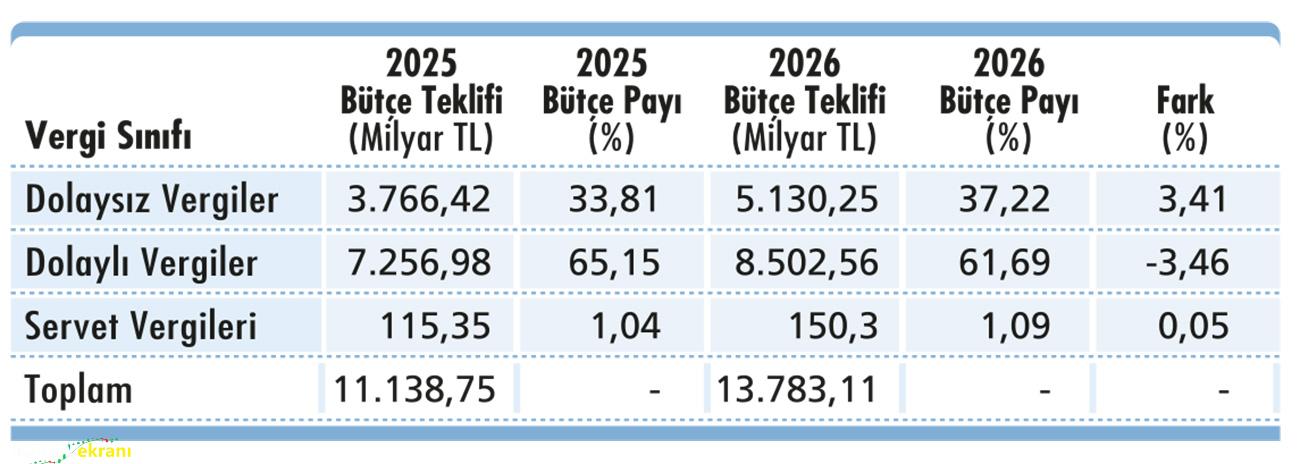 2026 – 2028 dönemi OVP’de ise vergi gelirlerindeki artış yüzde 28,41 olarak öngörülmüştü. 2026 bütçesinde vergi gelirler artışı yüzde 28,41 (ret ve iadeler sonrası) belirlenmiş olup, dolaysız (gelir üzerinden alınan vergiler) vergilerdeki artış yüzde 36,21, dolaylı vergilerdeki artış yüzde 17,16 ve servet vergilerindeki artış yüzde 30,30 olarak hedeflenmiştir. Diğer taraftan 2026 yılı bütçe kanun teklifine bakıldığında, dolaylı vergilerin bütçe vergi gelirleri içindeki payı yüzde 61,69, dolaysız vergilerin payı yüzde 37,22 olarak bütçelenmiştir. Yukarıdaki tabloya göre bir önceki yıla göre dolaysız vergilerin 2026 yılı bütçe vergi gelirlerindeki payı artacak ve en önemli artış gelir vergisinde.