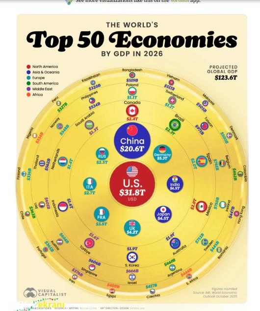2026 projeksiyonları, küresel ekonomide ağırlığın kademeli biçimde Asya’ya kaymaya devam ettiğini, gelişmiş ekonomilerde büyümenin daha sınırlı seyrettiğini gösteriyor. Türkiye ise küresel ölçekte orta büyüklükte, stratejik önemi yüksek ekonomiler arasında konumunu koruyor. IMF projeksiyonları, Voronoi / Visual Capitalist