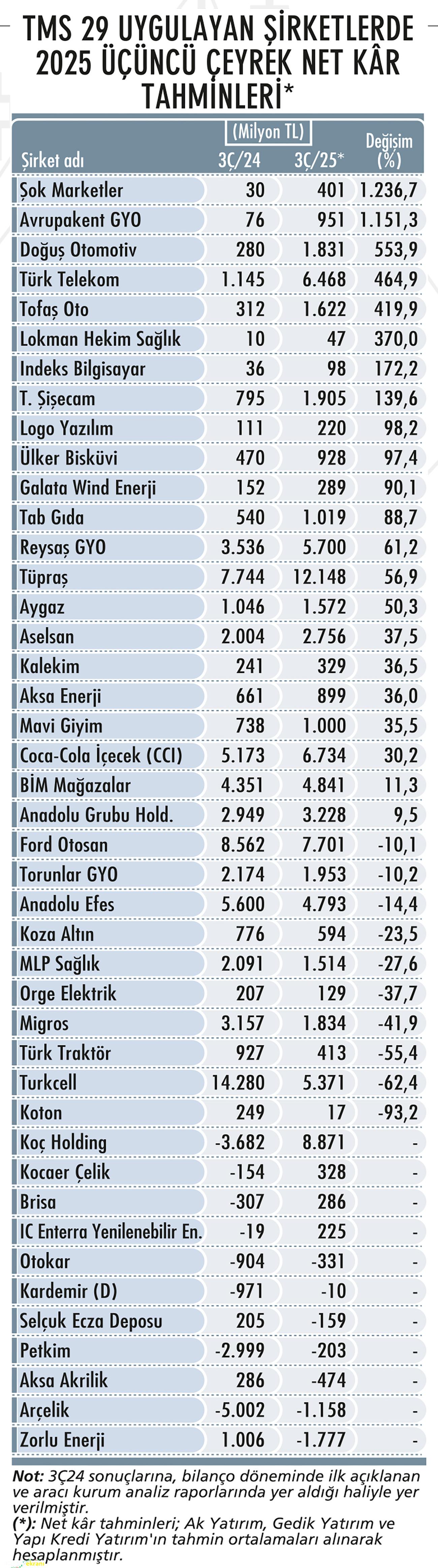 Kuveyt Türk Yatırım Araştırma Direktörü Dr. Kutay Gözgör ise, genel görünüm itibarıyla, üçüncü çeyrek bilançolarında reel kâr büyümesinin sınırlı kalmasını fakat birçok sektörde ‘dip noktanın geride bırakıldığı’ bir geçiş dönemi yaşanmasını bekliyor. Gözgör’e göre; şirketler için bu çeyrekte marj koruma, nakit akışı disiplinini güçlendirme ve finansman maliyetlerini yönetme becerisi öne çıkacak.