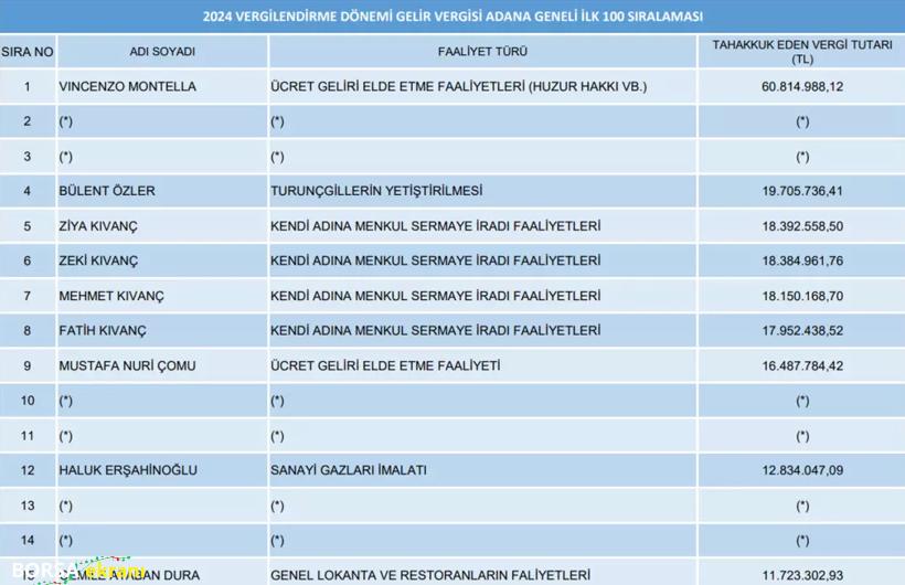 Adana Defterdarlığı, 2024 vergilendirme döneminde kent genelinde en yüksek vergi beyan eden mükellefleri kamuoyuna duyurdu. Açıklanan listede zirvede yer alan isim sürpriz bir şekilde futbol dünyasından geldi. Açıklanan Gelir Vergisi Adana Geneli İlk 100 Sıralaması‘nda birinci sırada, Türkiye A Milli Futbol Takımı‘nın teknik direktörü Vincenzo Montella yer aldı. Adana Defterdarlığı tarafından paylaşılan verilere göre, teknik direktör Montella’nın tahakkuk eden vergi tutarı 60 milyon 814 bin 988 TL 12 kuruş olarak açıklandı.