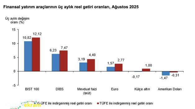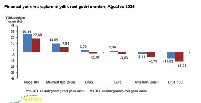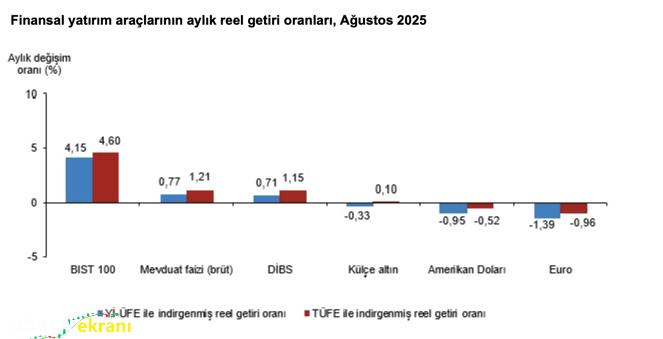 Investing.com – Türkiye İstatistik Kurumu (TÜİK), 2025 yılı Ağustos ayına ilişkin finansal yatırım araçlarının reel getiri oranlarını kamuoyuyla paylaştı. Açıklanan verilere göre, hem Yurt İçi Üretici Fiyat Endeksi (ÜFE) hem de Tüketici Fiyat Endeksi (TÜFE) baz alındığında, Ağustos ayında en yüksek reel getiriyi BIST 100 endeksi sağladı. BIST 100 endeksi, ÜFE’ye göre %4,15, TÜFE’ye göre ise %4,60 oranında reel getiri sunarak yatırımcıların Ağustos ayında en fazla kazanç elde ettiği yatırım aracı oldu. Aynı dönemde mevduat faizi (brüt), ÜFE’ye göre %0,77, TÜFE’ye göre %1,21 ile pozitif getiri sağladı. Devlet İç Borçlanma Senetleri (DİBS) de benzer şekilde ÜFE’ye göre %0,71, TÜFE’ye göre %1,15 oranında reel getiriyle yatırımcısına kazanç sağladı.