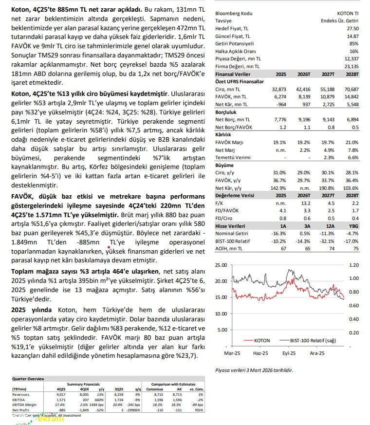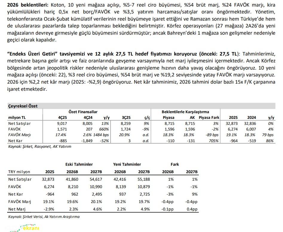 AK Yatırım’dan KOTON Şirketi 4Ç25 Kâr Değerlendirmesi