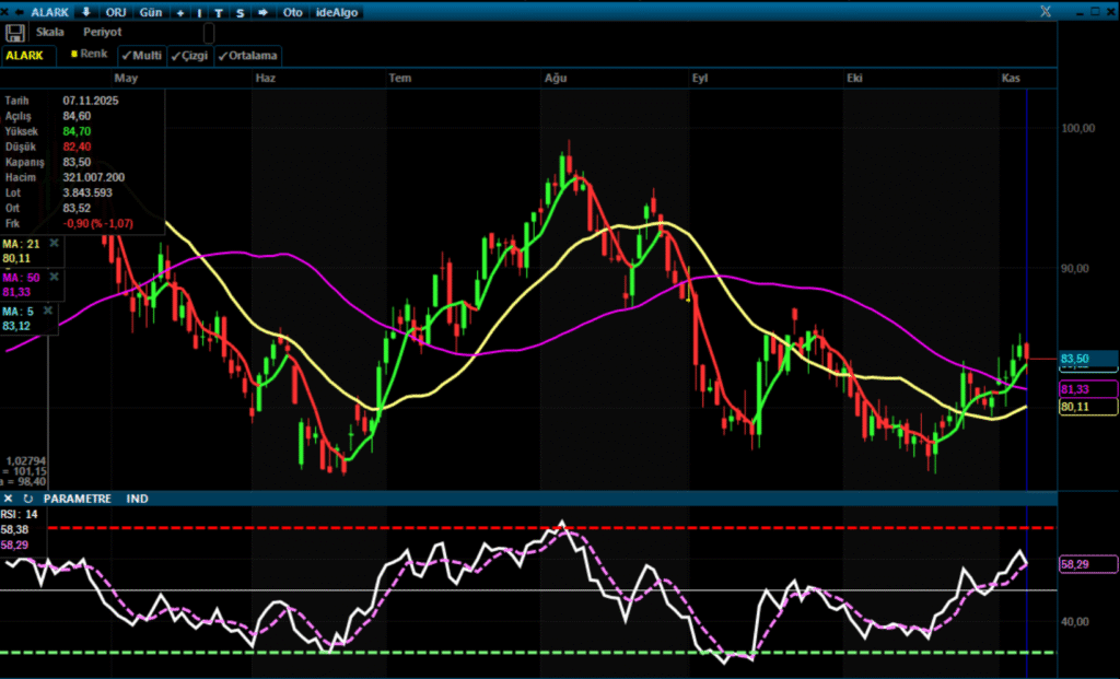 Teknik tarafta ise ALARK hissesi, bilanço açıklamasından önce 83,50 TL seviyesinden kapanış yaptı. Grafik görünümünde kısa vadeli ortalamalar yukarı yönlü eğilimini korurken, RSI göstergesi 58 seviyesinde bulunuyor. Bu durum, teknik olarak hissede temkinli bir yükseliş potansiyelinin sürdüğüne işaret ediyor.