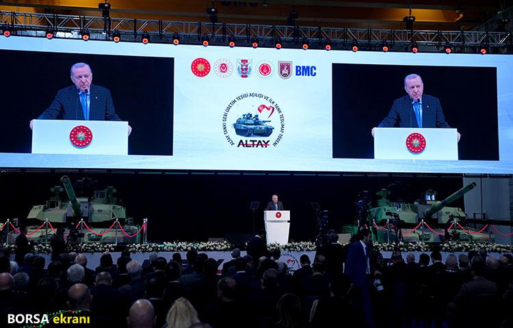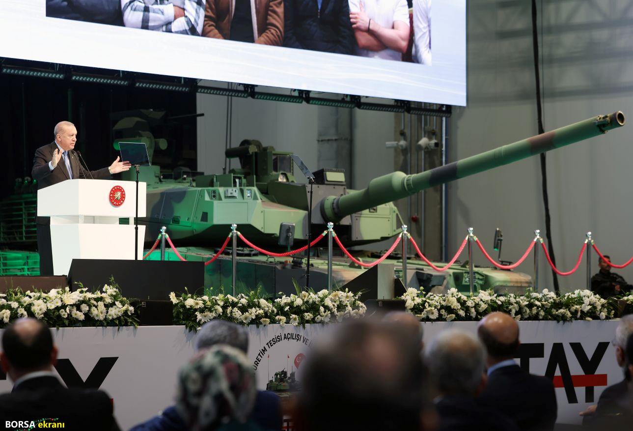 Erdoğan, yaptığı konuşmada, Katar Başbakan Yardımcısı ve Savunma Bakanı Şeyh Saud bin Abdurrahman bin Hasan bin Ali Al Sani başta olmak üzere törene teşrif eden her bir misafire teşekkür etti. Dün gece Balıkesir’in Sındırgı ilçesinde meydana gelen deprem dolayısıyla Balıkesirlilere geçmiş olsun dileklerini ileten Erdoğan, sözlerini şöyle sürdürdü:”6,1 büyüklüğündeki depremde Allah’a hamdolsun can kaybı yaşanmadı. İkincil sebeplerle yaralanan 26 vatandaşımız ise gerekli tıbbi müdahalelerin ardından taburcu edildi. İçişleri Bakanımız ekibiyle süratle bölgeye intikal etti, biz de kendisinden gerekli bilgileri aldık ve alıyoruz. Hasar tespit ve yıkılan binaların enkaz kaldırma çalışması devam ediyor. Rabb’im, ülkemizi her türlü afetten muhafaza eylesin diyorum.”Cumhurbaşkanı Erdoğan, Türk savunma sanayii adına büyük bir heyecanı ve aynı zamanda büyük bir gururu hep birlikte yaşadıklarını belirtti. Ülke savunma sanayiine, mühendis ve teknisyenlerine duydukları güvenin boşuna olmadığını, gerek bu tesis gerekse teslimatı yapılan Altay tankı ile bir kez daha gördüklerini vurgulayan Erdoğan, şunları söyledi:”Savunma sanayimizin gelişmesi, güçlenmesi, tam bağımsızlık hedefine ulaşması için canla başla çalışan herkese, sektördeki tüm kardeşlerime şükranlarımı sunuyorum. Bu uğurda ter döken şehadete eren kardeşlerime de Allah’tan rahmet niyaz ediyorum. Bilhassa geçen sene 23 Ekim’de TUSAŞ tesislerine yönelik kalleş saldırıda şehit olan vatan evlatlarını rahmet ve minnetle yad ediyorum. Başkanlığını yaptığım Savunma Sanayii İcra Komitesi’nde alınan kararlar ışığında, savunma sanayisinde tam bağımsız Türkiye hedefine doğru sağlam adımlarla ilerliyoruz. Bir yandan yeni projeleri yeni savunma ürünlerini geliştirip devreye alırken diğer yandan yeni tesislerimizin açılışını yapıyor, yerli ve milli araçlarımızı envanterimize katıyoruz.”