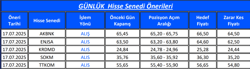 Önerilerin geçerlilik süresi, raporda belirtilen tarihle sınırlıdır. Belirtilen tarihe kadar hedef veya stop seviyesine ulaşmayan hisseler, öneri bitiş tarihindeki kapanış fiyatından kapatılmış sayılır ve bu durumla ilgili ayrıca bir bildirim yapılmaz.