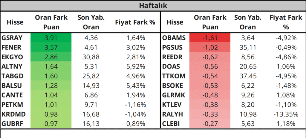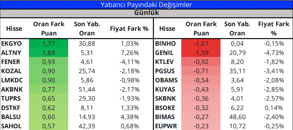 Günlük bazda yabancı payı en çok artan ve azalan hisselerin grafiklerine ise sonraki sayfalarda yer verilmiştir.