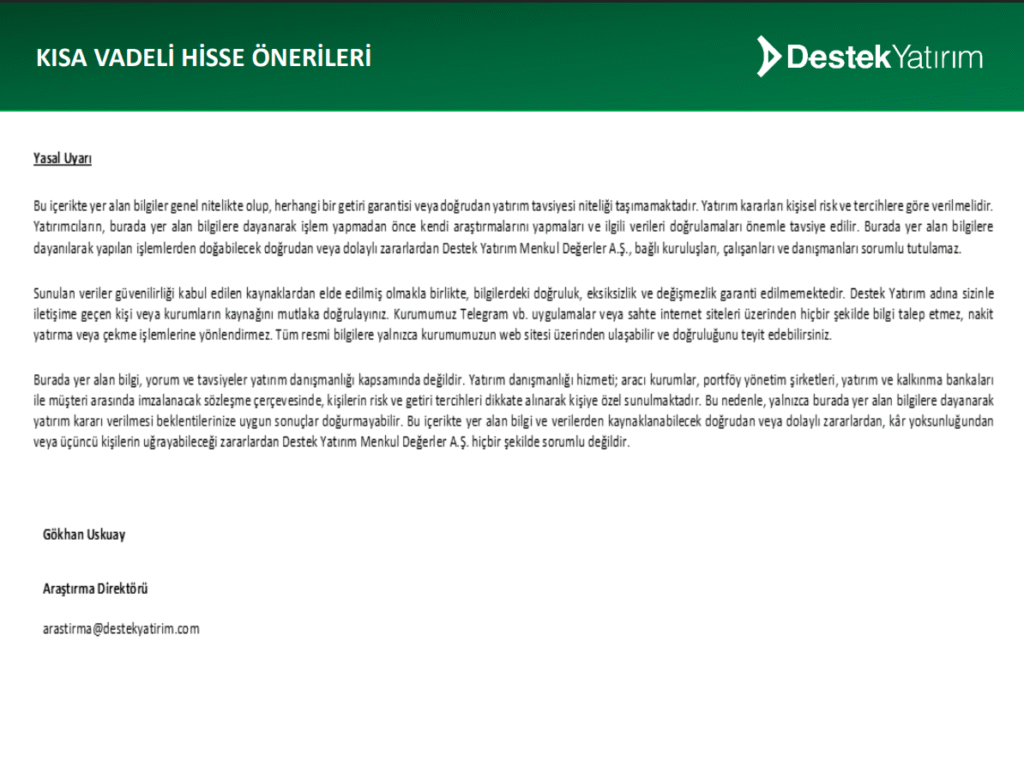 Burada yer alan yatırım bilgi, yorum ve tavsiyeleri yatırım danışmanlığı kapsamında değildir. Yatırım danışmanlığı hizmeti; aracı kurumlar, portföy yönetim şirketleri ve mevduat kabul etmeyen bankalar ile yatırımcı arasında imzalanacak sözleşme çerçevesinde sunulur.