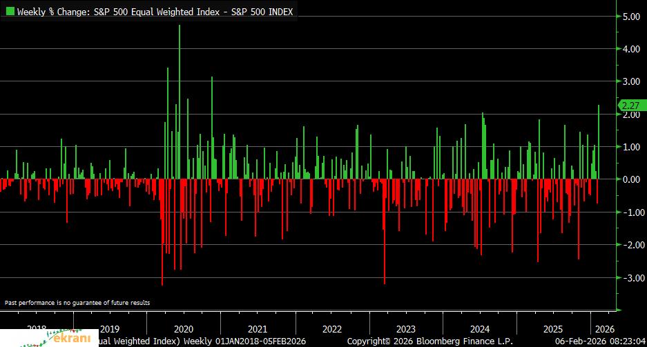 İkinci grafik, piyasanın genişliğini ölçen kritik bir soruya odaklanıyor: “Yükseliş kaç hisseyle taşınıyor?” Burada haftalık bazda, S&P 500 eşit ağırlık endeksinin getirisi ile klasik S&P 500 endeksinin getirisi arasındaki fark gösteriliyor. Eşit ağırlık, büyük şirketleri küçüklerle aynı “oy gücünde” sayar. Klasik endeks ise piyasa değeri büyük olanları daha ağır tartar. Bu nedenle iki endeks arasındaki fark, yükselişin tabana yayılıp yayılmadığını anlamak için iyi bir göstergedir.