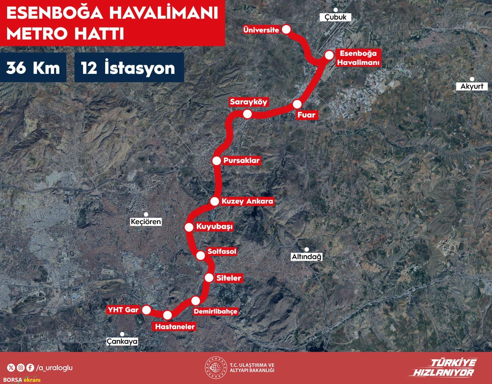 Esenboğa Havalimanı’na ulaşacak metro projesi kapsamında artan ulaşım ihtiyaçları ve yolcu talepleri doğrultusunda önemli güncellemeler yaptıklarını belirten Uraloğlu, “İlk etapta Kuyubaşı İstasyonu’ndan aktarma yapılarak planlanan hat artık YHT Gar’dan başlayacak şekilde yeniden kurgulandı. Yeni güzergah, Ankara’nın önemli ulaşım ve yerleşim merkezlerini doğrudan kapsayacak şekilde Esenboğa Havalimanı’na kadar uzanacak. Böylece YHT Gar’dan Esenboğa Havalimanı’na kadar aktarmasız, hızlı ve konforlu ulaşım imkanı sağlanacak.” ifadelerini kullandı.