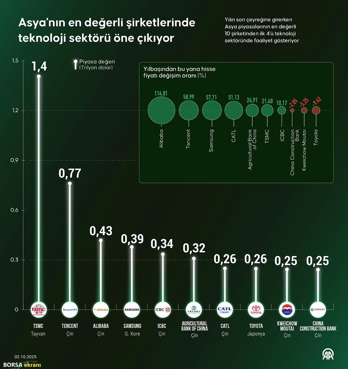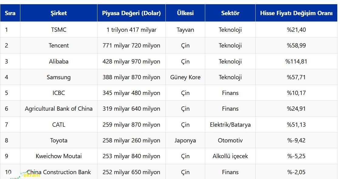 Ocak-ekim döneminde Asya’nın en değerli şirketi Taiwan Semiconductor Manufacturing Company (TSMC) olurken bölgedeki en değerli 10 şirketten 7’si Çinli, 1’i Güney Koreli, 1’i Japon ve 1’i Tayvanlı şirketlerden oluştu. nbsp;Dünyada 10. sırada bulunan Asya’nın en kıymetli şirketi konumundaki TSMC’nin piyasa değeri ekim sonu itibarıyla 1 trilyon 417 milyar dolara ulaştı. TSMC’yi piyasa değeri sıralamasında çevrim içi hizmetler ve ürünler, eğlence, yapay zeka, yazılım ve teknoloji alanında hizmet veren Çinli şirket Tencent takip etti. Tencent 771 milyar 720 milyon dolarlık değeriyle Çin’in en değerli şirketi olurken, dünya sıralamasında 15. sırada yer aldı. Asya’nın en değerli üçüncü şirketi olan bölgenin önemli teknoloji ve e-ticaret şirketlerinden Alibaba’nın piyasa değeri ise 428 milyar 970 milyon dolar olarak kayıtlara geçti. Alibaba’yı 388 milyar 870 milyon dolarla Güney Koreli teknoloji devi Samsung takip etti. Böylece bölgenin en değerli ilk 4 şirketi teknoloji sektöründe yer aldı.