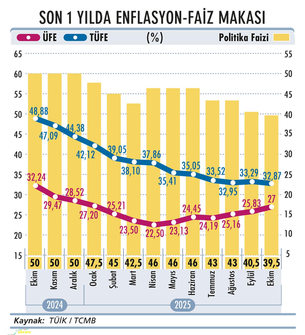 Piyasadaki genel beklenti, ekim enflasyonunun yüzde 2,7 ila yüzde 3 arasında gerçekleşmesiydi. Fakat tüketici enflasyonu ekim ayında beklentilerin altında gelerek yüzde 2,55 oranında artış gösterdi. Yıllık enflasyon da yüzde 32,87 olarak hesaplandı. Üretici Fiyat Endeksi ise aylık yüzde 1,63 artarken; yıllık yüzde 27 seviyesini gördü. Tüketici Fiyat Endeksi, eylülde piyasa beklentilerini aşarak yüzde 3,23 oranında artış gösterirken, yıllık enflasyon yüzde 33,29 olarak gerçekleşmişti.