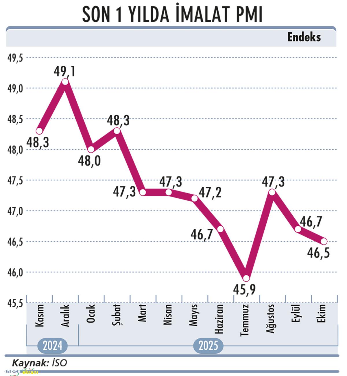 Sanayide çarkların yavaşlaması 19’uncu ayına girdi. İstanbul Sanayi Odası (İSO) Türkiye İmalat PMI anketinin Ekim 2025 dönemi sonuçlarına göre, eylülde 46,7 olan manşet PMI ekimde hafif bir düşüşle 46,5’e gerileyerek son üç ayın en düşük değerini aldı. Eşik değer olan 50’nin üzerinde ölçülen tüm rakamların sektörde iyileşmeye işaret ettiği anket sonuçları, imalat sanayi sektörünün faaliyet koşullarında bozulmanın 19’uncu aya ulaştığına ve düşüşün eylül ayına kıyasla daha yüksek oranda gerçekleştiğine işaret ediyor. Ayrıca rapor, son dört ayda ilk kez olmak üzere, anket kapsamında izlenen 10 sektörün tamamında üretimin yavaşladığını gösterdi. Anket katılımcılarının geri bildirimleri, müşteri talebinde zayıflamaya ve buna bağlı olarak da yeni siparişlerde yavaşlamayı da gösteriyor.
