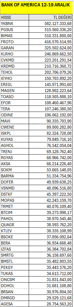 Bank of America’ın haftalık bazda Borsa İstanbul’da en fazla yatırım yaptığı hisselerin listesi. Listeyi PDF formatında indirip inceleyebilirsiniz.