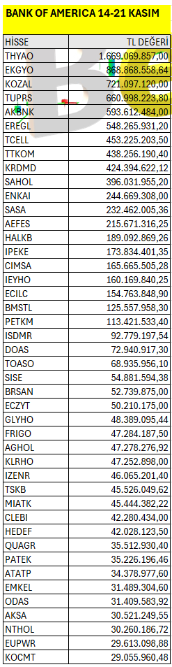 Bank of America’ın haftalık bazda Borsa İstanbul’da en fazla yatırım yaptığı hisselerin listesi. Listeyi PDF formatında indirip inceleyebilirsiniz.