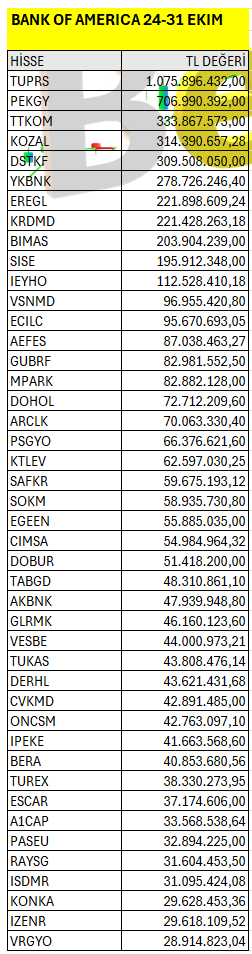 Bank of America’ın haftalık bazda Borsa İstanbul’da en fazla yatırım yaptığı hisselerin listesi. Listeyi PDF formatında indirip inceleyebilirsiniz.