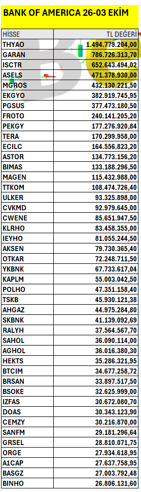 Bank of America’ın haftalık bazda Borsa İstanbul’da en fazla yatırım yaptığı hisselerin listesi. Listeyi PDF formatında indirip inceleyebilirsiniz.