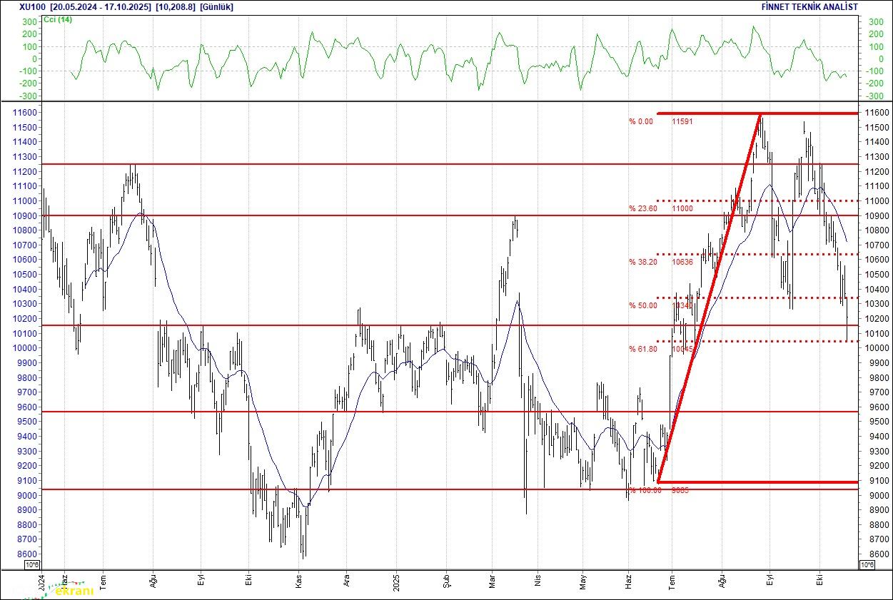 Endeks içerisinde geçtiğimiz hafta en yüksek işlem hacmi 59.97 milyar TL ile Türk Hava Yolları hissesinde olurken, bu şirketi 28.51 milyar TL ile Akbank takip etti. Endeksin düşüşünde Banka ve Banka nbsp;sektörlerindeki kayıpların etkili olduğu görülmekte. Endeks geçtiğimiz haftayı yüzde 4.77 azalışla 10,209 puandan kapattı. Endeksin dolar bazında fiyatı ise 244 seviyesinde bulunuyor. Endeksin geçtiğimiz haftaki ortalama işlem hacmi 107.89 milyar TL olarak gerçekleşti. BİST 100 endeksi 7, 20 ve 50 günlük hareketli ortalamalarının altında hareket ediyor. Endeksin hareketli ortalamalarının altında kalması aşağı yönlü hareketleri destekleyebilir. RSI göstergesi 33.12 seviyesinde bulunan endeksin momentumunun 90.99 seviyesinde olduğu görülüyor. CCI göstergesinin -153.90 seviyesinde olması endeksi yukarı yönde destekleyebilir. Yukarı yönlü hareketlerde 10,351 ve 10,494 direnç seviyeleri olarak takip edilecek. Olası geri çekilmelerde ise 10,060 ve 9,911 destek seviyeleri söz konusu. 2 yıllık tahvil faizi 39.97 seviyesinde bulunuyor.