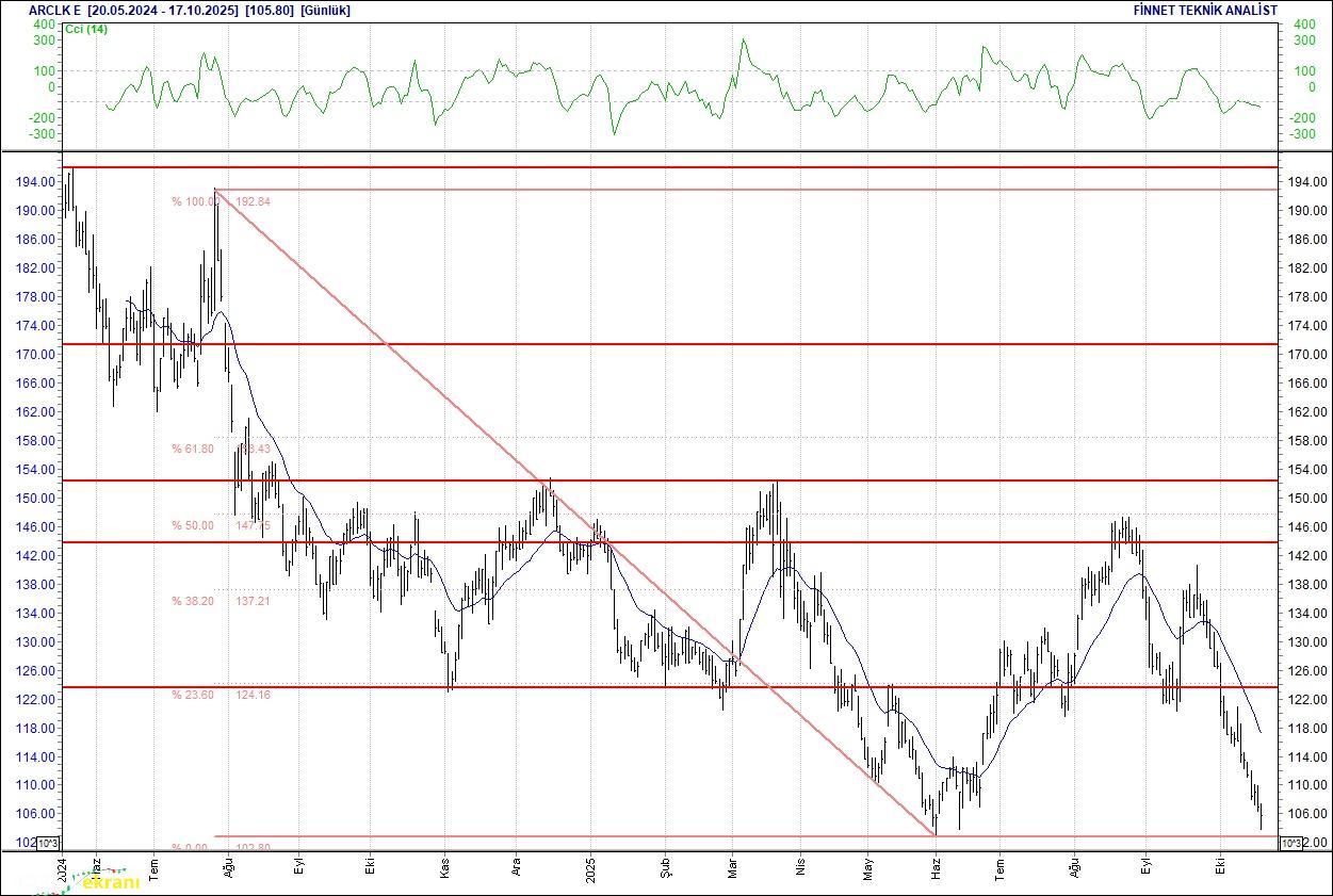 ARÇELİK DESTEK ARAYIŞINDA Düşüş seyrinde olduğu gözleniyor. 105.8 seviyesinin altındaki kapanışlarda 97.00 seviyesindeki desteğini test edebilir. Bu seviyenin üzerinde tutunmayı başarabilirse 119.00 seviyesindeki direncine doğru atağa geçebilir. 20 günlük ortalamasının altında. Alım aralığı: 97.00-95.50 Satım aralığı: 119.00-129.00 Endeks Ağırlığı (%): 0.59 Haftalık Değişim: IMKB 100 Endeksindeki ağırlığı geçen haftaya göre -0.017 puan azaldı.
