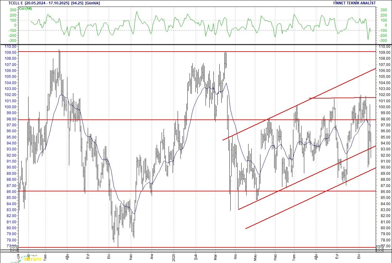 TURKCELL DESTEK ARAYIŞINDA Düşüş seyrinde olduğu gözleniyor. 94.25 seviyesinin altındaki kapanışlarda 91.00 seviyesindeki desteğini test edebilir. Bu seviyenin üzerinde tutunmayı başarabilirse 97.50 seviyesindeki direncine doğru atağa geçebilir. 20 günlük ortalamasının altında. Alım aralığı: 91.00-87.00 Satım aralığı: 97.50-96.00 Endeks Ağırlığı (%): 3.70 Haftalık Değişim: IMKB 100 Endeksindeki ağırlığı geçen haftaya göre -0.052 puan azaldı.