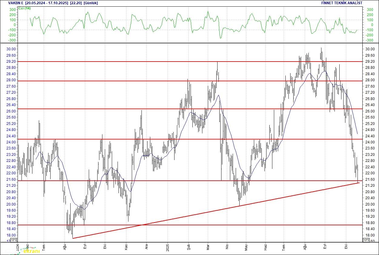 VAKIFLAR BANKASI DESTEK ARAYIŞINDA Düşüş seyrinde olduğu gözleniyor. 22.2 seviyesinin altındaki kapanışlarda 20.20 seviyesindeki desteğini test edebilir.