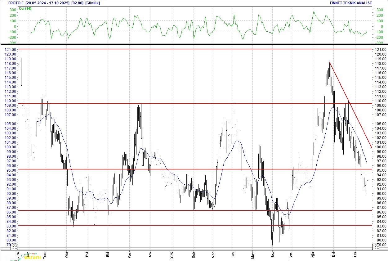 FORD OTOSAN DESTEKLERİNDE TUTUNMAYI DENEYEBİLİR 94.45 seviyesini kıramayınca satışlarla karşılaştı. Satış baskısının sürmesi halinde 88.00 seviyesinde tutunmayı deneyebilir. 92.8 seviyesinin üzerindeki kapanışlarda ilk direnç 97.00 seviyesinde bulunuyor. 20 günlük ortalamasının altında. Alım aralığı: 88.00-87.00 Satım aralığı: 97.00-103.00 Endeks Ağırlığı (%): 1.86 Haftalık Değişim: IMKB 100 Endeksindeki ağırlığı geçen haftaya göre -0.003 puan azaldı.