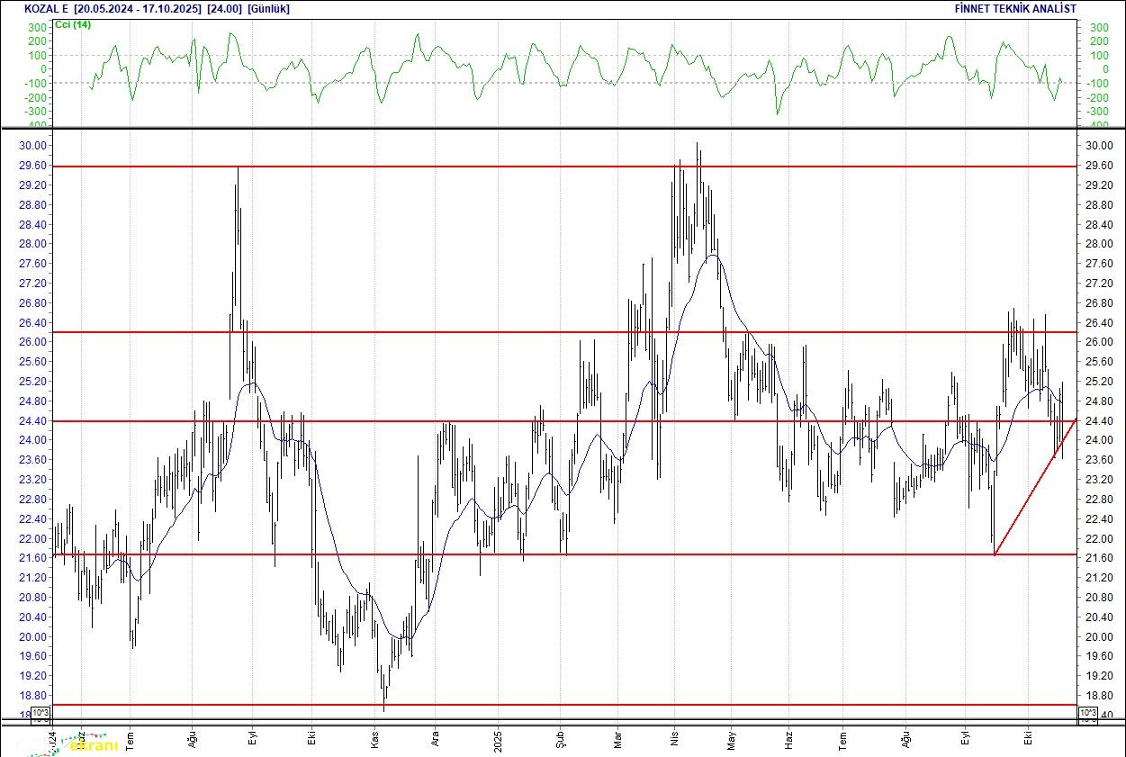 KOZA ALTIN GÜÇ KAYBEDİYOR 25.2 seviyesinin üzerine çıkamadı. Güç kaybediyor, satışların sürmesi halinde 23.30 seviyesindeki desteğine gerileyebilir. 24 seviyesinin üzerindeki alımlar ise hissede alıcıların güçlenmesini sağlayabilir. 20 günlük ortalamasının altında. Alım aralığı: 23.30-22.20 Satım aralığı: 25.00-24.70 Endeks Ağırlığı (%): 0.75 Haftalık Değişim: IMKB 100 Endeksindeki ağırlığı geçen haftaya göre 0.026 puan arttı.
