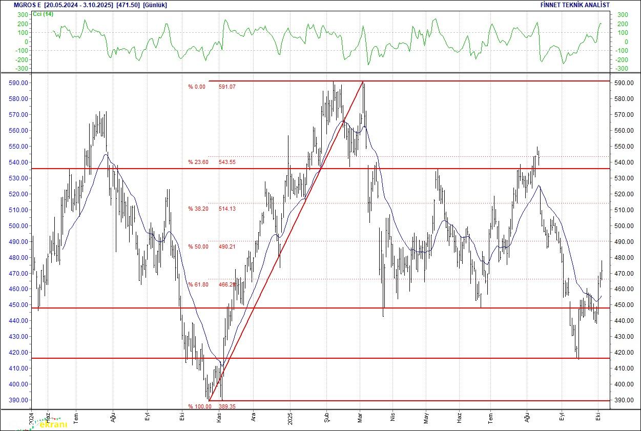 37.3 seviyesinin altındaki kapanışlar güç kaybının sürmesine neden olabilir. 20 günlük ortalamasının altında. Alım aralığı: 36.25-35.50 Satım aralığı: 39.00-40.75 Endeks Ağırlığı (%): 0.68 Haftalık Değişim: IMKB 100 Endeksindeki ağırlığı geçen haftaya göre 0.005 puan arttı. MİGROS TİCARET ÇIKIŞTA Alıcılar güçleniyor. 438.25 seviyesinden başlayan yükseliş seyrinde. 471.5 seviyesinin üzerinde tutunmayı başarması halinde 504.00 seviyesindeki direncine yönelebilir.