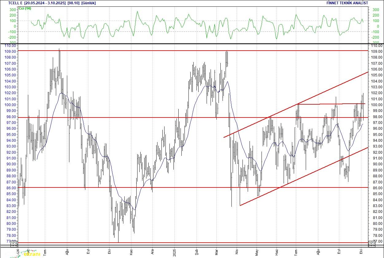 Olası bir satış dalgasında 445.00 seviyesinin test edilmesi beklenebilir. 20 günlük ortalamasının üzerinde. Alım aralığı: 445.00-435.00 Satım aralığı: 480.00-480.00 Endeks Ağırlığı (%): 1.31 Haftalık Değişim: IMKB 100 Endeksindeki ağırlığı geçen haftaya göre 0.058 puan arttı. TURKCELL İZLENMELİ 96.3 – 102 aralığında hareket eden hisse 98.1 seviyesinin altında kapanışlarda 95.00 seviyesindeki desteğini test edebilir. 98.1 seviyesinin üzerindeki kapanışlarda ise direnç 101.00 seviyesinde bulunuyor.