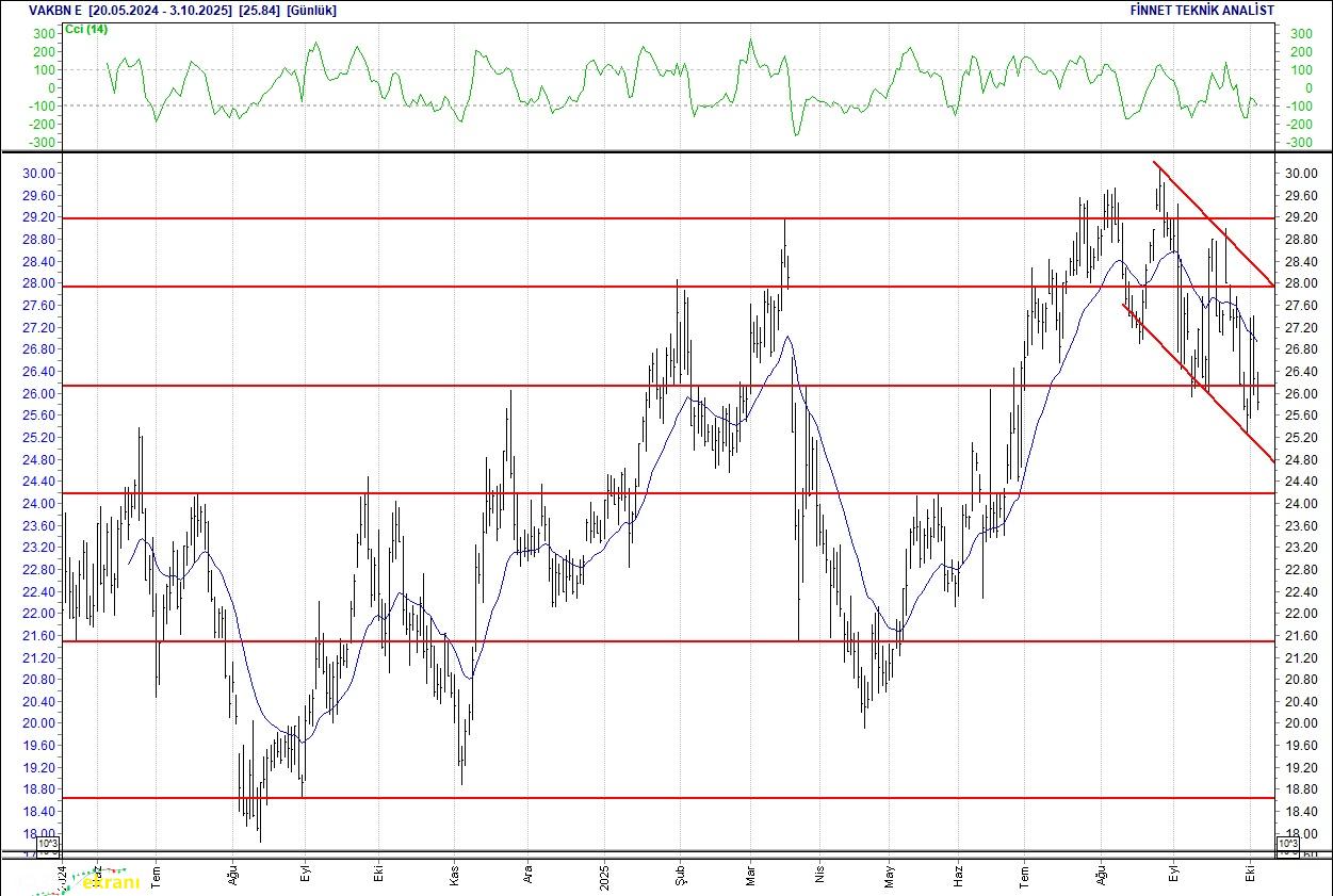 106 seviyesinin üzerindeki kapanışlarda ilk direnç 111.30 seviyesinde bulunuyor. 20 günlük ortalamasının altında. Alım aralığı: 104.00-102.00 Satım aralığı: 106.00-110.00 Endeks Ağırlığı (%): 0.47 Haftalık Değişim: IMKB 100 Endeksindeki ağırlığı geçen haftaya göre 0.002 puan arttı. VAKIFLAR BANKASI DİRENÇTE ZORLANDI 25.26-27.42 aralığında hareket eden hisse güç kaybediyor. 25.84 seviyesinin altında kapanışlarda 25.00 seviyesine gerileyebilir. 26.75 seviyesinin üzerindeki kapanışlarda ise 26.75 seviyesine doğru hareketlenebilir.