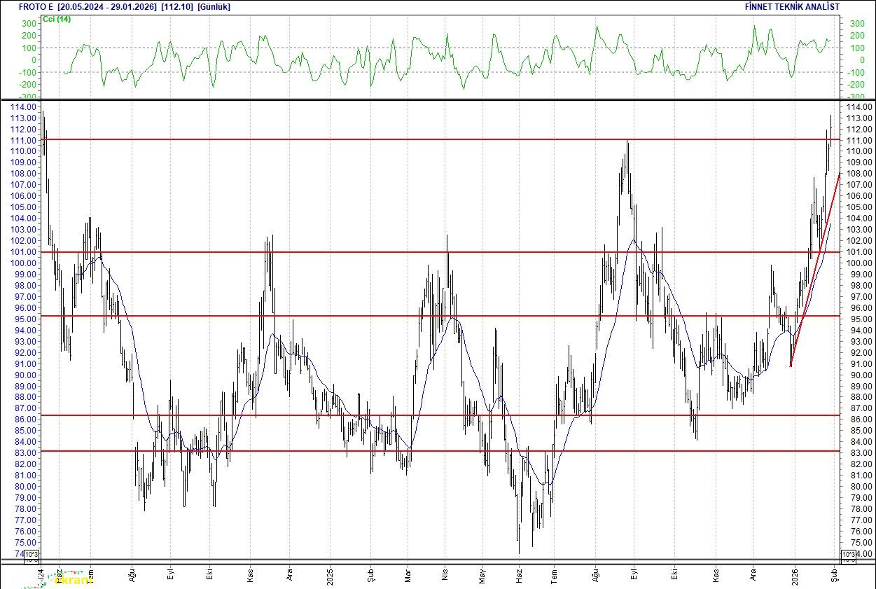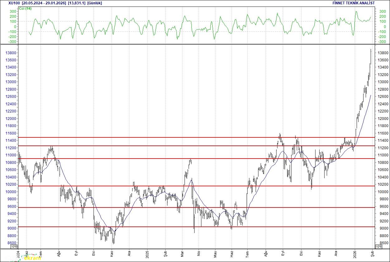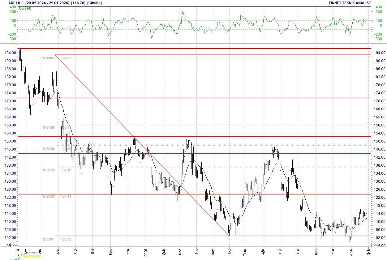 Endeks içerisinde geçtiğimiz hafta en yüksek işlem hacmi 102.45 milyar TL ile Türk Hava Yolları hissesinde olurken, bu şirketi 93.96 milyar TL ile Aselsan takip etti. Endeksin yükselişinde Enerji sektöründeki yükselişin etkili olduğu görülmekte. Endeks geçtiğimiz haftayı yüzde 7.62 yükselişle 13,831 puandan kapattı. Endeksin dolar bazında fiyatı ise 319 seviyesinde bulunuyor. Endeksin geçtiğimiz haftaki ortalama işlem hacmi 222.19 milyar TL olarak gerçekleşti. BİST 100 endeksi 7, 20 ve 50 günlük hareketli ortalamalarının üzerinde hareket ediyor. Endeksin hareketli ortalamalarının üzerinde kalması yukarı yönlü hareketleri destekleyebilir. RSI göstergesi 88.89 seviyesinde bulunan endeksin momentumu 111.67 seviyesinde. CCI göstergesinin 169.04 seviyesinde olması endeksi aşağı yönde baskılayabilir. Aşağı yönlü hareketlerde 13,572 ve 13,313 destek seviyeleri olarak takip edilecek. Olası yukarı yönlü hareketlerde ise 13,998 ve 14,165 direnç seviyeleri söz konusu. 2 yıllık tahvil faizi 33.58 seviyesinde bulunuyor. Arçelik Dirençler İzlenmeli Hareketlendiği gözleniyor. 112.2 seviyesinden alımların güçlendiği dikkat çekiyor.