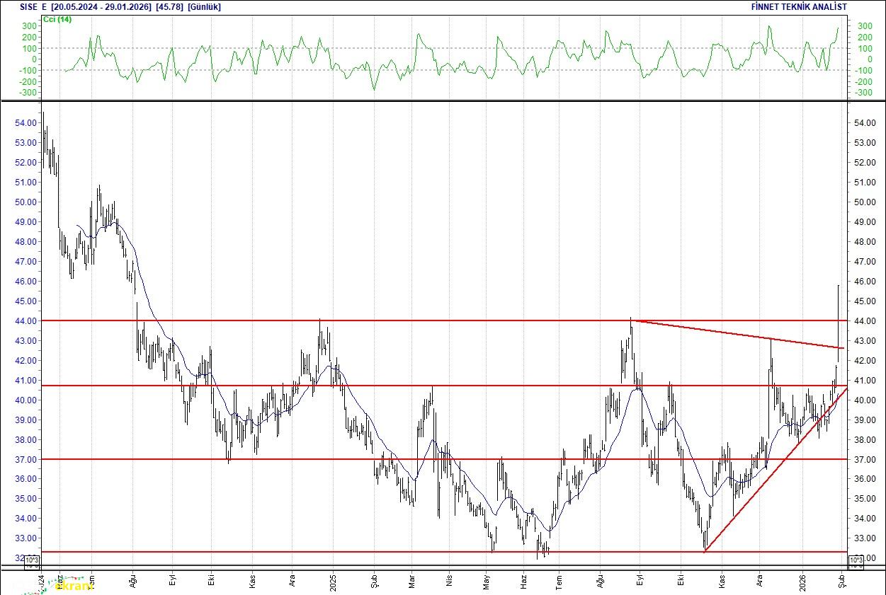 Şişe Cam Hacimli çıkıyor 45.78 seviyesinden başlayan nbsp;hacimli yükseliş seyrinde. 45.78 seviyesinin üzerinde tutunması halinde 49.35 seviyesini test edebilir. 45.78 seviyesinin altına kayması halinde 40.00 seviyesine doğru geri çekilme yaşanabilir. 20 günlük ortalamasının üzerinde. Alım aralığı: 40.00-39.00 Satım aralığı: 47.00-46.75 Endeks Ağırlığı (%): 1.54 Haftalık Değişim: IMKB 100 Endeksindeki ağırlığı geçen haftaya göre 0.009 puan arttı.
