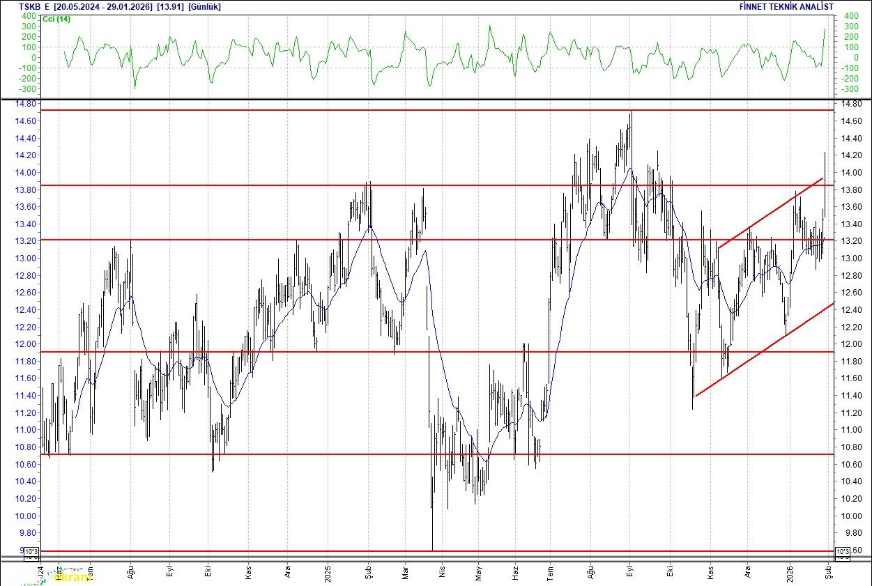 T.S.K.B. Dirençler izlenmeli Yükseliş seyrinde olduğu dikkat çekiyor. 12.96 seviyesinden gelen alımlarla atağa geçti. 13.91 seviyesinin üzerinde kapanışlarda 14.60 seviyesine yönelebilir. 13.91 seviyesinin altında kapanışlarda 12.67 seviyesine doğru geri çekilme yaşanabilir. 20 günlük ortalamasının üzerinde. Alım aralığı: 13.30-13.00 Satım aralığı: 13.90-14.20 Endeks Ağırlığı (%): 0.36nbsp; Haftalık Değişim: IMKB 100 Endeksindeki ağırlığı geçen haftaya göre -0.003 puan azaldı.