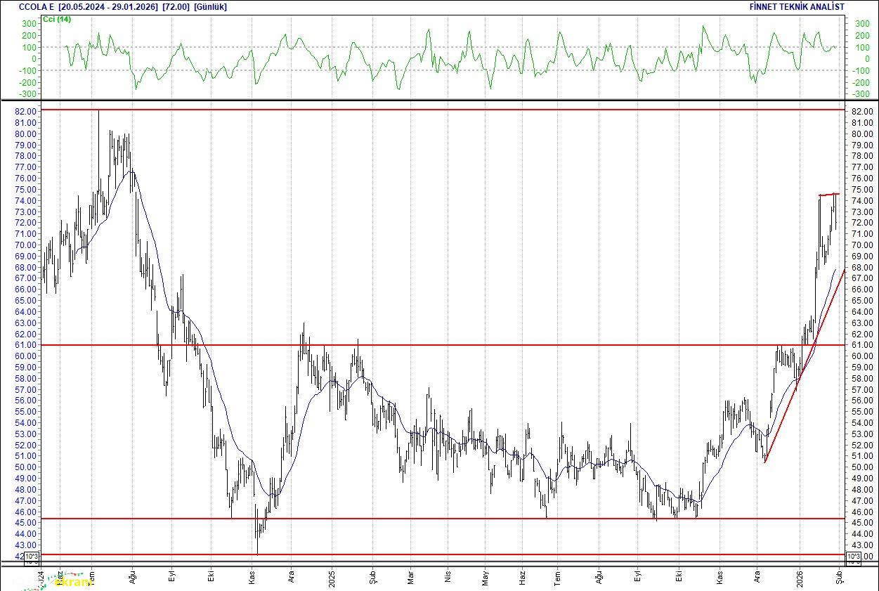 İşlem hacminde azalma gözleniyor. Senedin ilk desteği 4.28 seviyesinde bulunurken ilk direnci 5.35 seviyesinde bulunuyor. 20 günlük ortalamasının üzerinde. Alım aralığı: 4.28-4.00 Satım aralığı: 5.35-5.18 Endeks Ağırlığı (%): 0.40 Haftalık Değişim: IMKB 100 Endeksindeki ağırlığı geçen haftaya göre -0.002 puan azaldı. Coca Cola İçecek Desteğinin üzerinde tutunmalı 67.00 seviyesindeki desteğinin üzerinde. Desteğinin üzerinde tutunmayı başarabilirse, 76.00 seviyesine doğru çıkışı sürebilir.