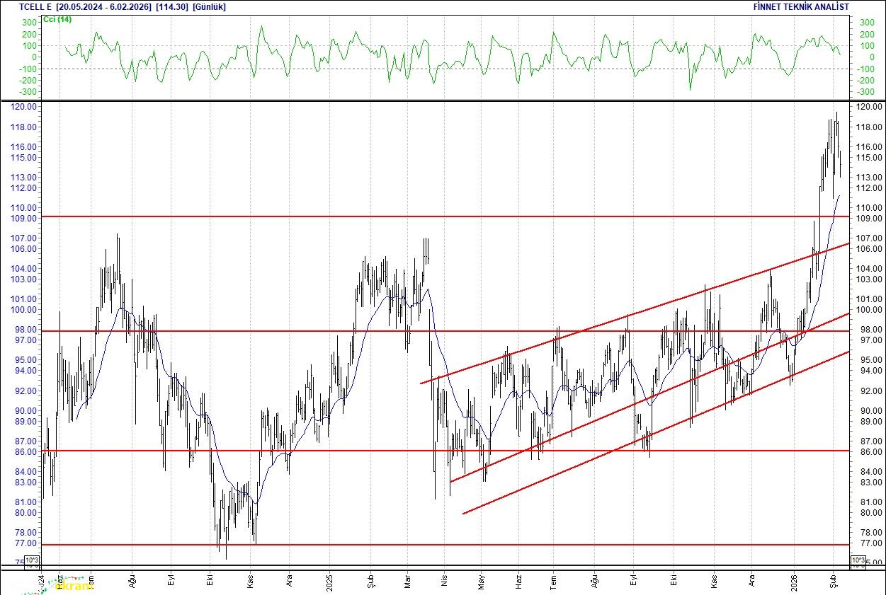 TAV Havalimanları Desteğinin üzerinde tutunmalı 332.50 seviyesindeki desteğinin üzerinde. Desteğinin üzerinde tutunmayı başarabilirse, 375.00 seviyesine doğru çıkışı sürebilir. 358.25 seviyesinin altına kayması halinde ise 332.50 seviyesine doğru geri çekilme yaşanabilir. 20 günlük ortalamasının üzerinde. Alım aralığı: 332.50-312.50 Satım aralığı: 375.00-382.50 Endeks Ağırlığı (%): 1.50 Haftalık Değişim: IMKB 100 Endeksindeki ağırlığı geçen haftaya göre 0.049 puan arttı. Turkcell Satıcılar güçlü Güç kaybediyor. 119.5 seviyesinden gelen satışlarla düşüş seyrinde.