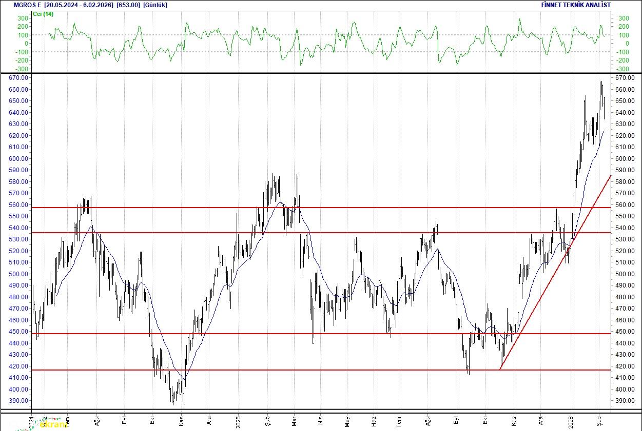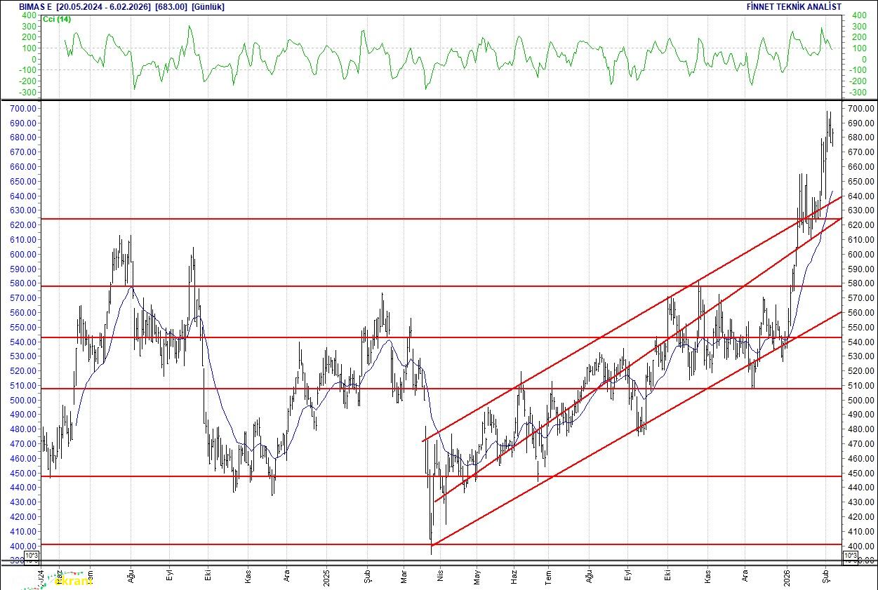 Bim Mağazalar Dirençler izlenmeli Güç topluyor. 638 seviyesinden gelen alımlarla çıkış seyrinde.