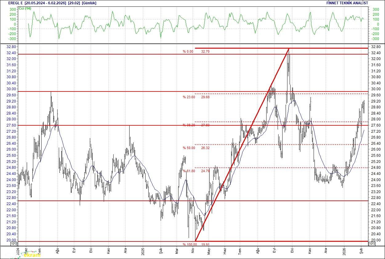 23.76 seviyesinin altındaki kapanışlarda 22.00 seviyesindeki desteğini test edebilir. Bu seviyenin üzerinde tutunmayı başarabilirse 25.25 seviyesindeki direncine doğru atağa geçebilir. 20 günlük ortalamasının üzerinde. Alım aralığı: 22.00-21.80 Satım aralığı: 25.25-25.25 Endeks Ağırlığı (%): 1.13 Haftalık Değişim: IMKB 100 Endeksindeki ağırlığı geçen haftaya göre -0.048 puan azaldı. Ereğli Demir Çelik Dirençler izlenmeli Güç topluyor. 26.84 seviyesinden gelen alımlarla çıkış seyrinde.