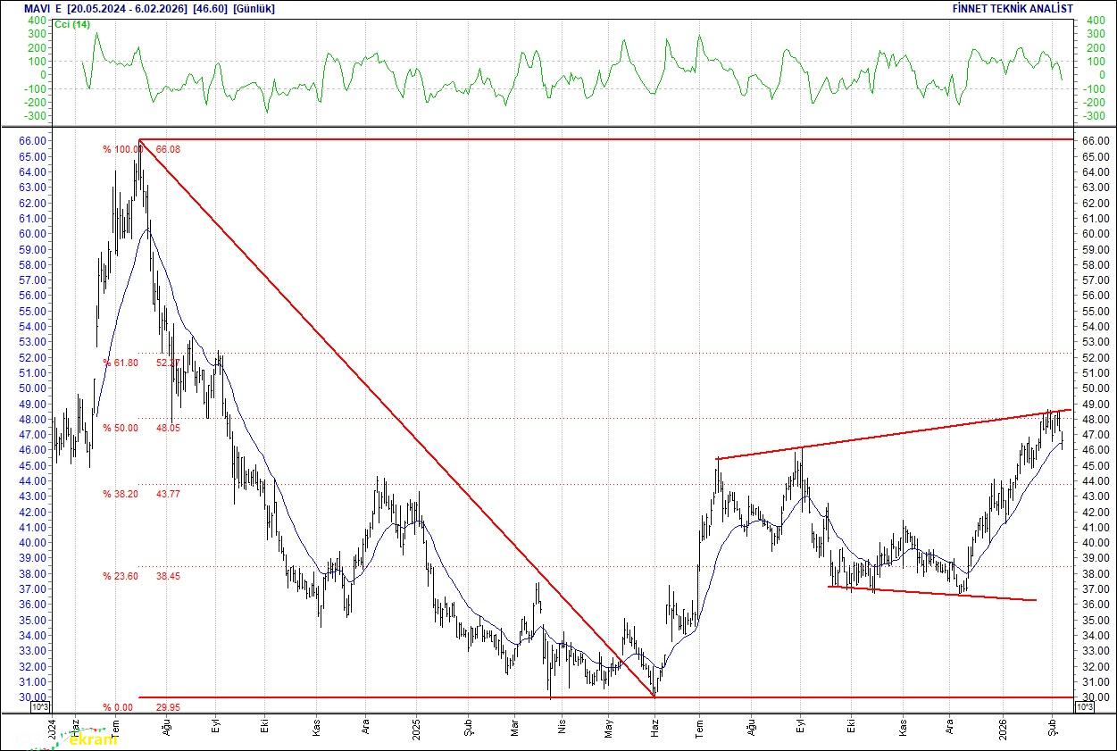 30.50 seviyesindeki direncin aşılması hissede alımların güçlenmesini sağlayabilir. İlk destek 27.00 seviyesinde bulunuyor. 20 günlük ortalamasının üzerinde. Alım aralığı: 27.00-25.25 Satım aralığı: 30.50-30.75 Endeks Ağırlığı (%): 2.34 Haftalık Değişim: IMKB 100 Endeksindeki ağırlığı geçen haftaya göre 0.083 puan arttı. Mavi Giyim Güç kaybediyor 48.64 seviyesinin üzerine çıkamadı.
