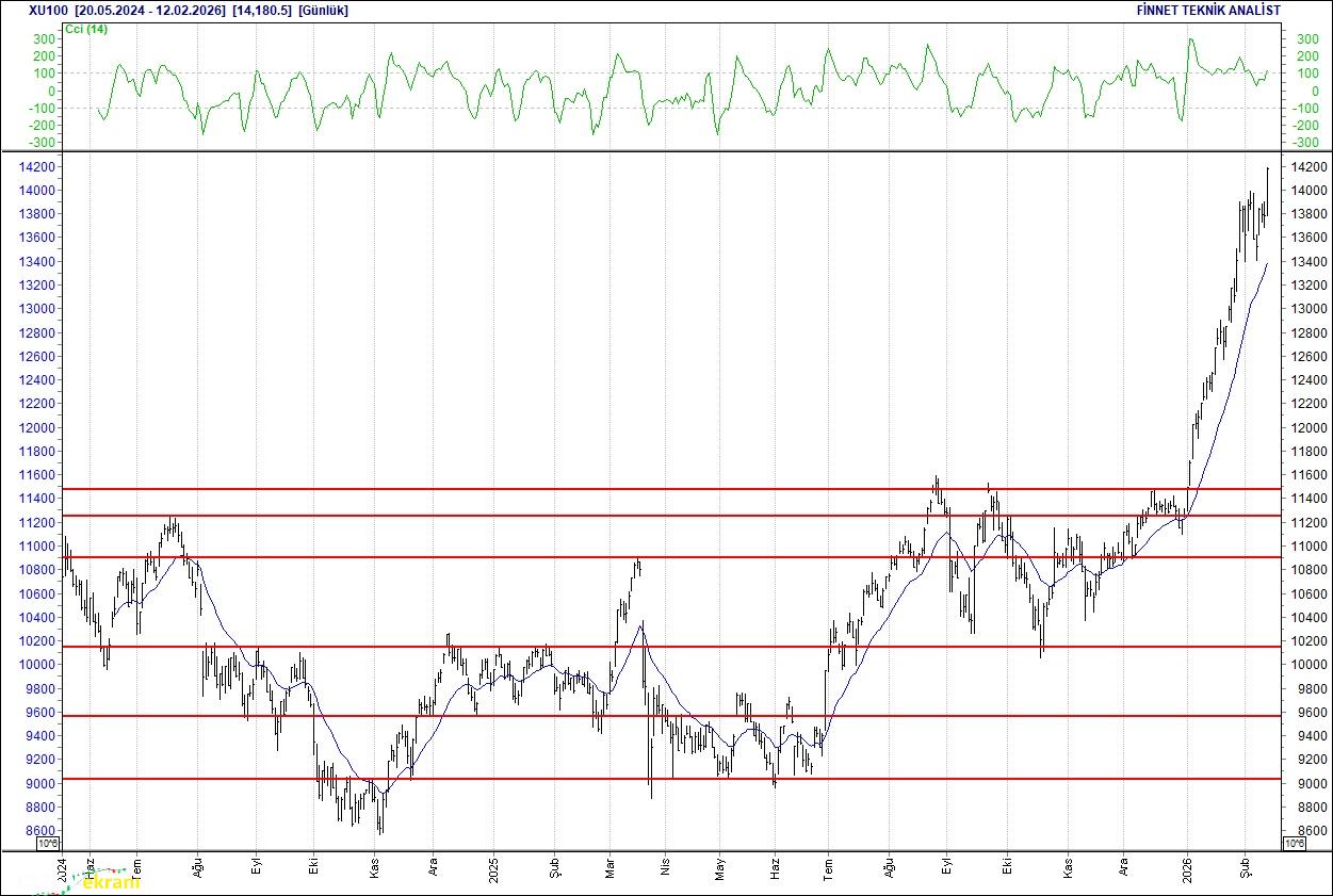 Aşağı yönlü hareketlerde 13,911 ve 13,642 destek seviyeleri olarak takip edilecek. Olası yukarı yönlü hareketlerde ise 14,323 ve 14,466 direnç seviyeleri söz konusu. 2 yıllık tahvil faizi 34.88 seviyesinde bulunuyor.