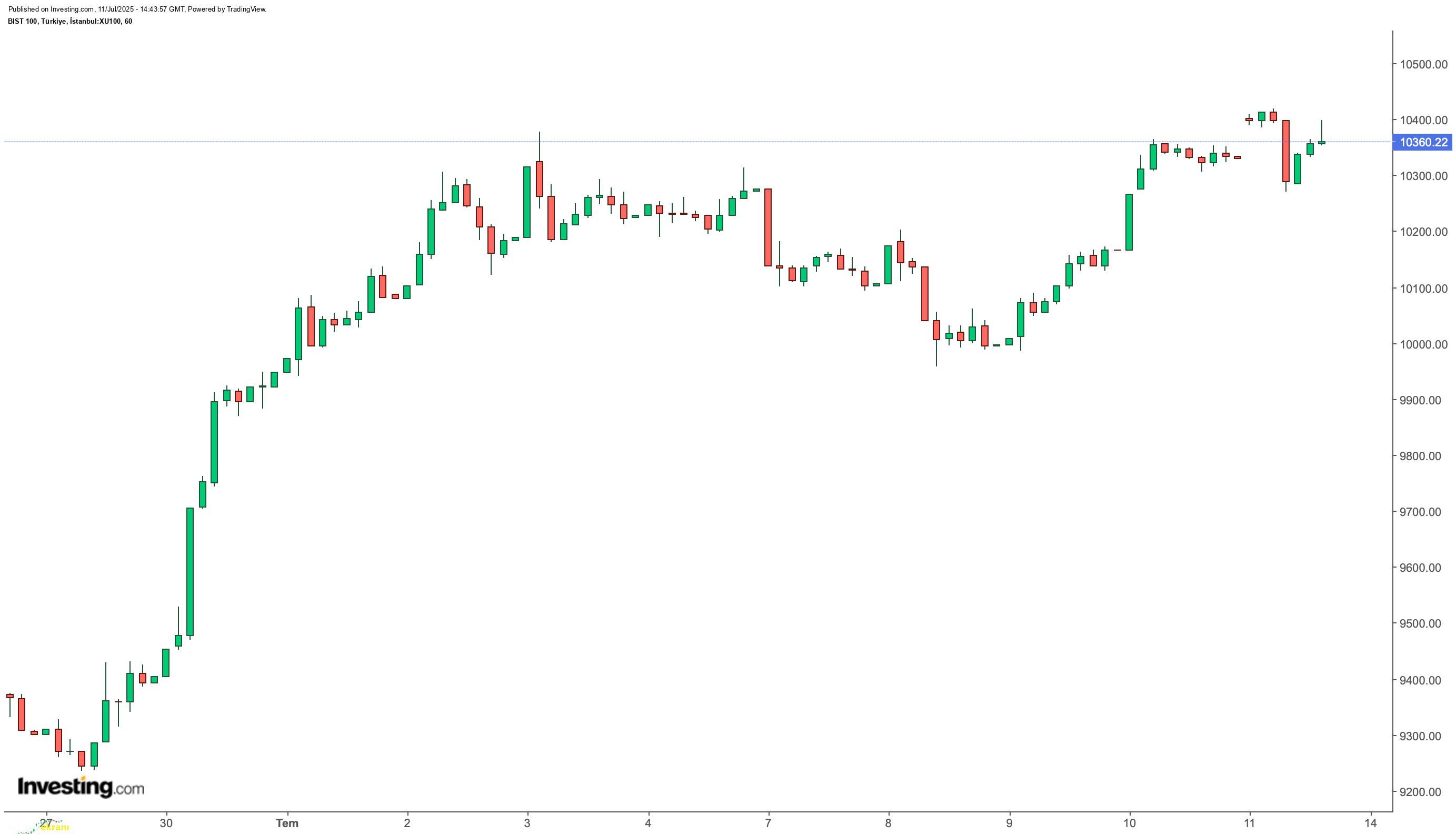 Investing.com – BIST 100 endeksi haftanın son işlem gününde volatil hareket ederken pozitif eğilimini korudu. Endeks, güne 10.441 puana doğru yükselişle başladıktan sonra gün içi işlemlerde gelen satışlarla 10.270 puana kadar geriledi. Ancak alıcılar, günün dip seviyelerinde yeniden devreye girerken BIST 100’ü kapanışa doğru 10.360 puan bandına taşıdı. Son duruma göre endeks, haftalık bazda %1’e yakın değer artışına sahip. Bugünkü volatil işlemlerde BIST 100’de işlem hacmi 100 milyar TL’yi aşarken toplam hacim, kapanışa doğru 150 milyar TL’ye yaklaştı. Sektör endeksleri bazında; aracı kurumlar, turizm ve spor endeksi bugün en çok yükselenler oldu. İletişim, metal, faktoring ise ekside kalan sektör endekslerinin başında yer aldı. Bankalar ise bugün yatay kaldı.
