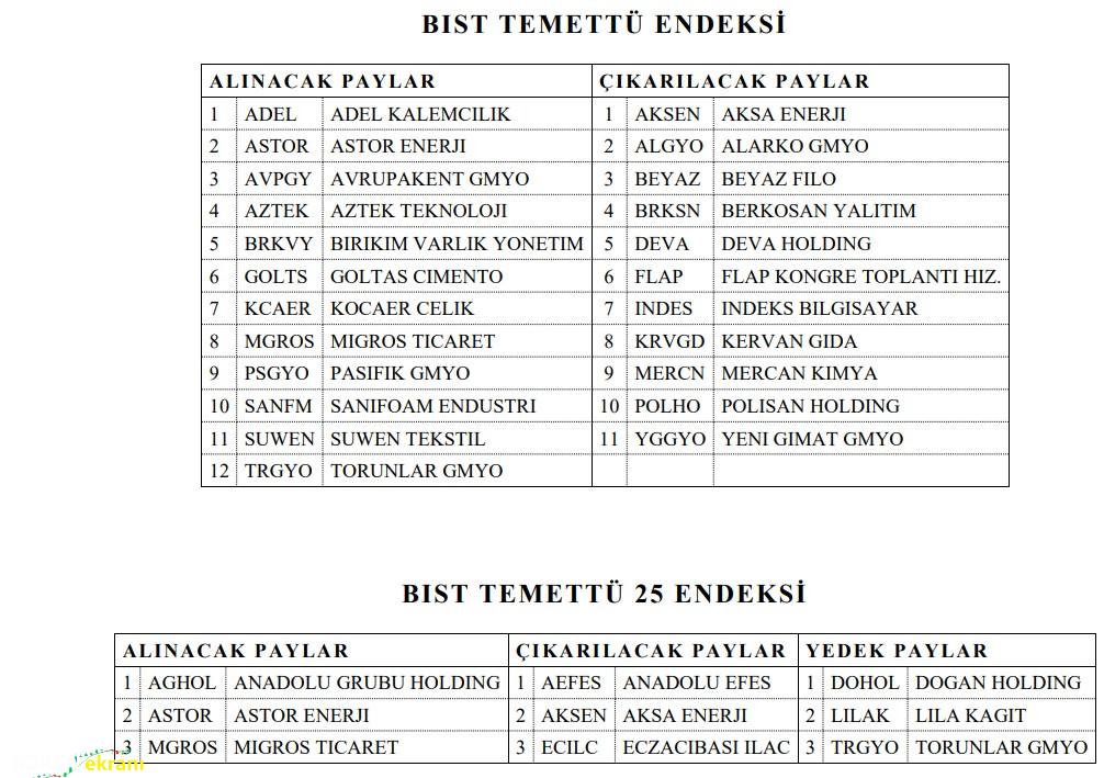 Borsa İstanbul’dan yapılan açıklamada “BIST Piyasa Değeri Ağırlıklı Pay Endeksleri Kural Seti’nin 10.3. maddesine istinaden Borsa İstanbul Genel Müdürlüğünce; BIST Temettü ve BIST Temettü 25 endekslerinde 01/08/2025 – 31/10/2025 dönemi için ekte gösterilen değişikliklerin yapılmasına karar verilmiştir” denildi. İşte paylaşılan tablo:nbsp; nbsp;