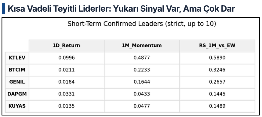 Kısa vadeli güçlü sinyal üreten hisselerin sayısının oldukça sınırlı olduğu belirtilirken, liderliğin genişlememesi durumunda mevcut yükselişin sürdürülebilirliğinin zayıflayabileceği ifade ediliyor. Buna karşın geride kalan hisse sayısının fazla olması, aşağı yönlü fiyatlamanın daha yaygın olduğunu gösteriyor.