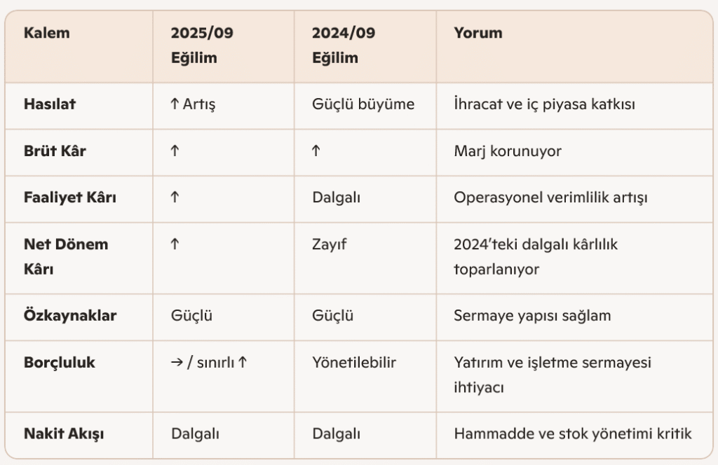 - Net dönem kârı 2024’e göre toparlanma eğiliminde.